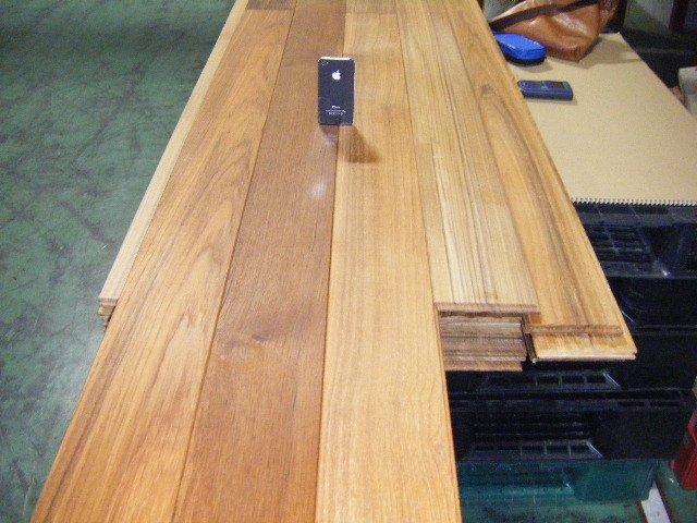 TS120(厚15x幅120x長1,820)の一枚物(OPC)本チークフローリングが入荷しました。このサイズの一枚物は中々お目にかかることができないレアな一品です。待ちに待ってやっとこさ入荷しました。昨年ミャンマーで加工前の材料を見ていたので期待が膨らみます。到着後、早速倉庫で検品です。