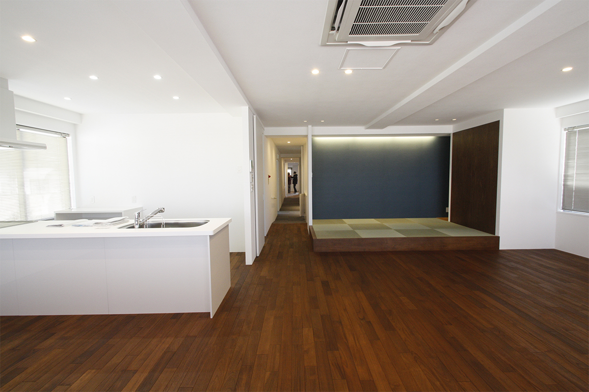 施工後の写真です。オープンキッチン・スキップフロアの和室と藍色のクロスに濃い色合いのチーク無垢床材が良く合います。
