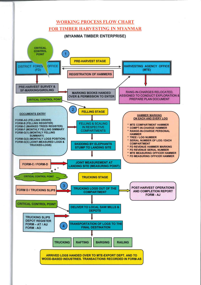 下図では間伐材の選定から、巻き枯らし、象による運搬、計測、製材所への運搬までにおいて、4つのチェックポイントがあり、それぞれに正規ルートで流通が行われているか書面での確認が行われていることを表しております。