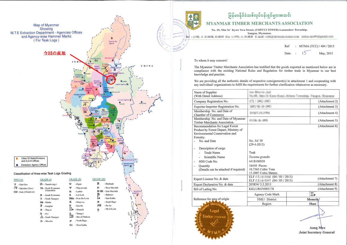 今回入荷するミャンマーチークの産地証明書が届きました。 ミャンマーでは2014年の丸太輸出禁止以降、違法伐採や盗伐の撲滅に向けて、官民をあげて様々な取り組みを行っております。そして、ヨーロッパ版のFSC認証ともいえるFLEGT(Forest Law Enforcement Governance and Trade)の認証取得を目指しております。