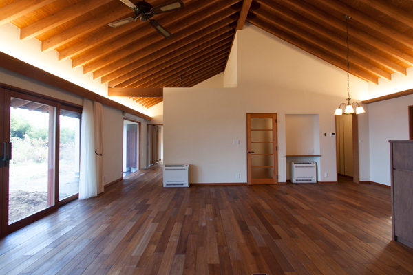 バリ島のリゾートをイメージした平屋建てのT様邸。垂木や梁を現しにして、オスモカラーのチーク色で色合いを統一されました。金物にはロートアイアンを使用し、木目の中にある黒色がアジアンリゾートの雰囲気を醸し出しています。窓からは海が一望でき、素晴らしい景観が広がります。掃きだし窓は木製サッシです。壁は珪藻土左官仕上げです。間接照明が穏やかに映っています。