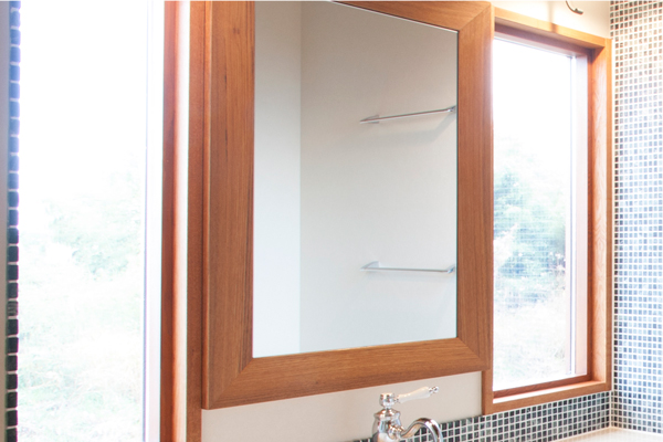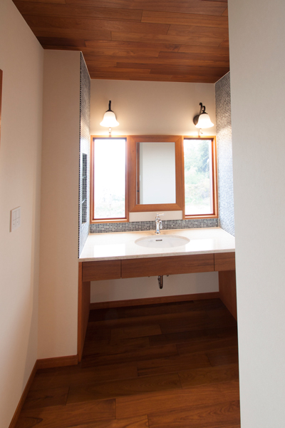 チークの角材を家具屋さんで加工して、鏡の枠と洗面台引き出しの幕板に納めております。天井と床面もチークフローリングです。チーク無垢材で作った鏡、テーパーがかかって立体的な素晴らしいデザインです。自分用にも欲しくなりました。