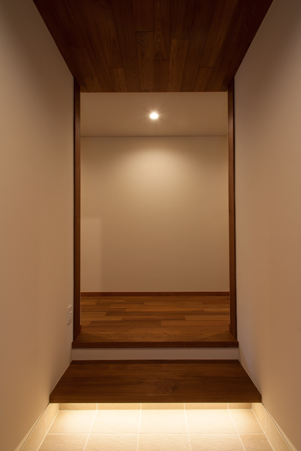特に玄関は、玄関ドア枠、式台、玄関框、玄関柱、天井をチーク材で統一しました。お邪魔して、初めて玄関を見たときには思わず「おぉー」と声をあげてしまいました。式台に関しては、奥行きが380mmもあり存在感が際立ちます。最近は式台のある家が少なくなりましたが、框だけでなく式台もある玄関は雰囲気が違いますね。この玄関はT様こだわりの空間です。