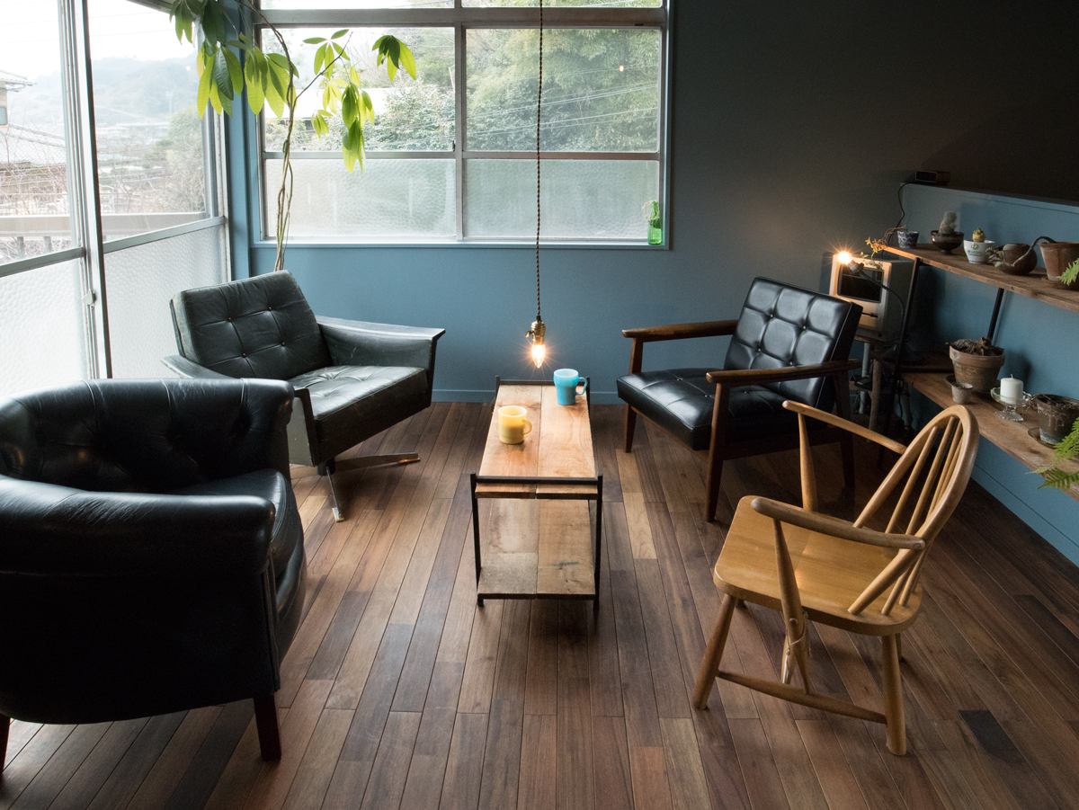 打合せスペースです。チョコレートブラウンのアジアンウォールナットの床にシルバーブルーのウォールペイントが映えます。落ち着いた色あいの壁が素敵ですね。個性的なチェアも味があります。Life + Architect様では、家具・雑貨の販売も行っているとの事です。