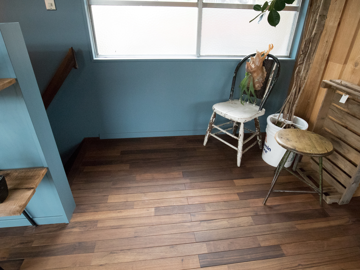AWN70アジアンウォールナットとWRK120チーク幅広乱尺をご採用頂いたLife + Architect様へお邪魔してきました。丁度、施工から一年程経ったところです。2Fが仕事場兼打合せスペースになっており、その床にアジアンウォールナットの12mm厚x70mm幅品をチョイスしていただきました。