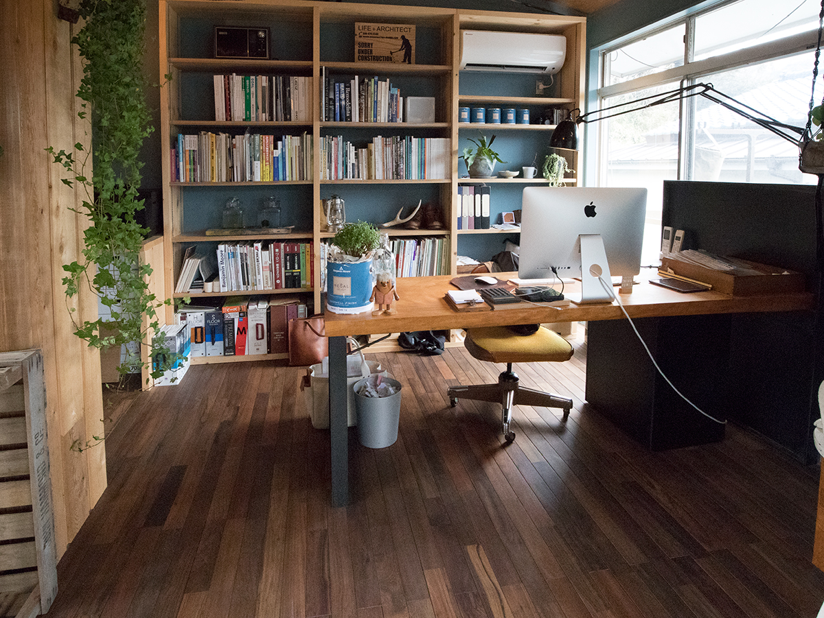 男の仕事場という雰囲気がいい感じです。フローリング表面はオイル塗装を施して濃い色あいになっております。