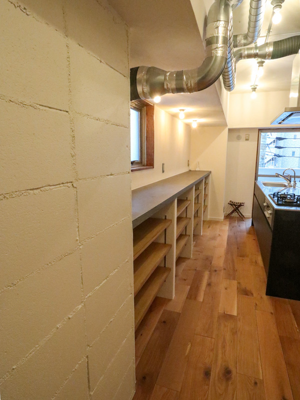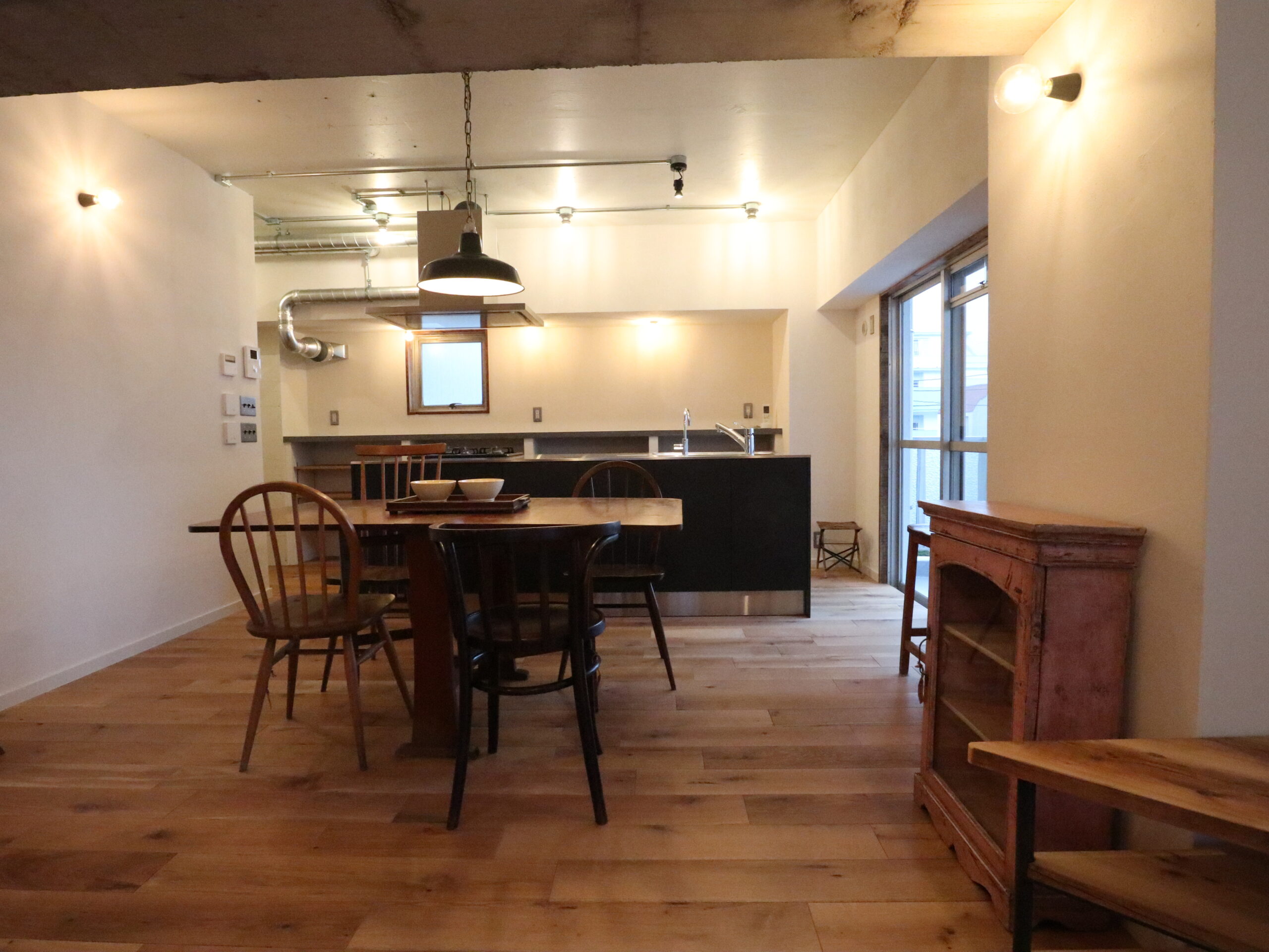 こちらのリノベ事例は弊社従業員の住宅として築40年の駅チカ・大型スーパー至近のヴィンテージマンションをフルスケルトンでリノベしたものです。年季の入った築年数を活かすインダストリアルな雰囲気をほんのりと出しました。