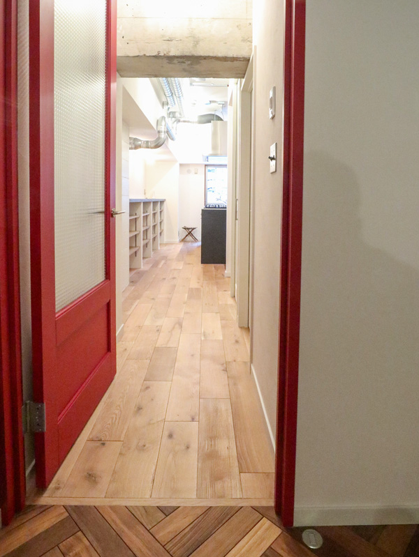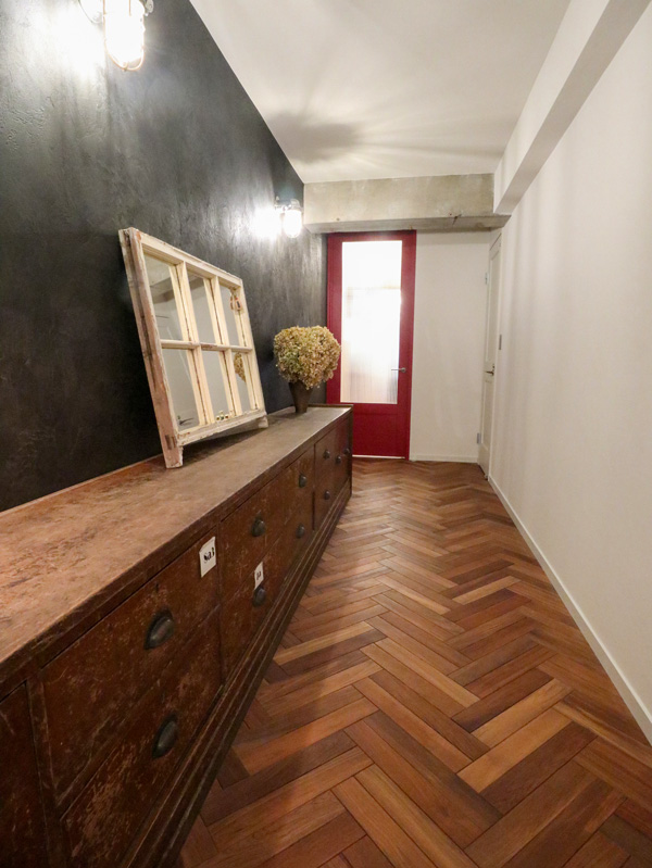 玄関から居室までに長めの廊下があります。ミャンマーチークヘリンボーン<弊社品番THB15>とアンティークの船外照明とローボードを設置。ローボードは収納力抜群なので、様々な用途に使えます。
