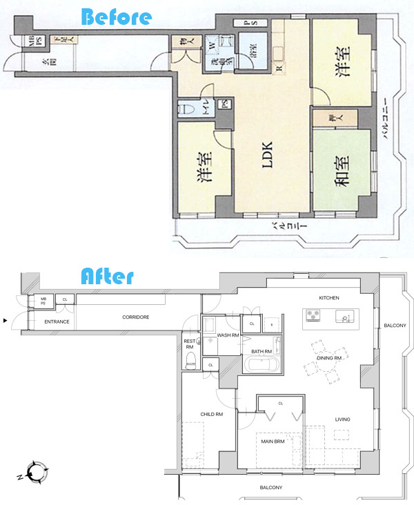 いかがでしたでしょうか。最後にBeforeAfterの間取り図とリノベ前の居室をご紹介します。